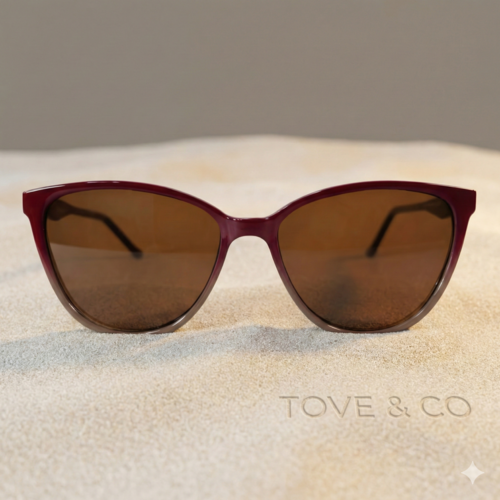 Com armação em tom bordô com transição para marrom opaco e acabamento polido, o modelo traz um formato levemente gatinho que emoldura o rosto com elegância discreta. As lentes em marrom criam profundidade visual, oferecem conforto aos olhos e garantem proteção total contra os raios solares.