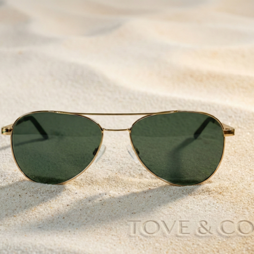 Um clássico absoluto do aviador. A lente verde traz leitura retrô sofisticada, enquanto o dourado mantém a elegância.